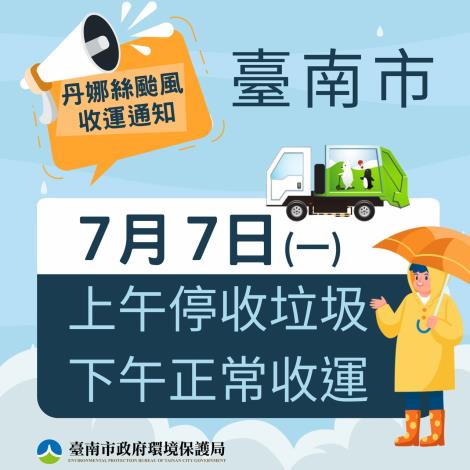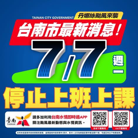 受中度颱風丹娜絲影響,臺南市今晚至明(7)日凌晨將有明顯風力及強降雨,且濱海地區風勢較強,恐有致災之虞,為維護市民安全及災後復原,臺南市政府6日晚上八點宣布,明(7)日停止上班、停止上課。 臺南市政府呼籲市民,對於私人所屬的廣告招牌、住宅懸掛物、盆栽、屋頂水塔等物,務必加強固定措施,避免受強風豪雨傾倒而發生傷人的意外,共同維護公共安全。另外也提醒民眾非必要請勿外出,有任何需求請撥打1999市民服務專線,亦可利用「台南水情即時通」手機APP掌握最新情況。明日7/7(一)上午清潔隊員全力優先投入恢復市容,下午垃圾正常收運。