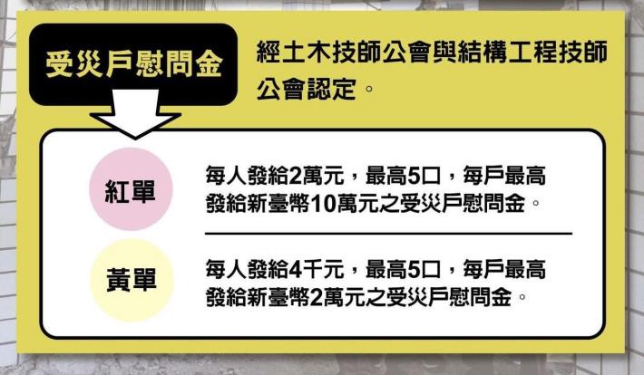 安遷救助:僅紅單受災戶,每人2萬元(最高5口,每戶最高10萬元)攜帶文件:1.身分證2.戶口名簿3.實際居住證明4.存摺5.印章6.照片(後補可)