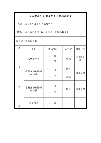 本區中元祭祖法會訂於114年9月4日(星期四)下午2時二地(北寮思親堂及南化懷恩堂)同時舉行,因故誦經科儀時間提前進行,詳如活動程序表。